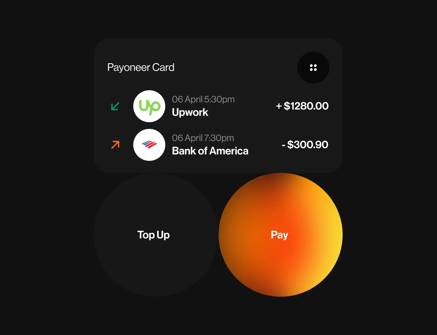 Since the home screen is the main interaction point of Payoneer customer, we placed all the necessary information for managing and monitoring their finances there. This includes features like checking various card balances and viewing recent transactions.
