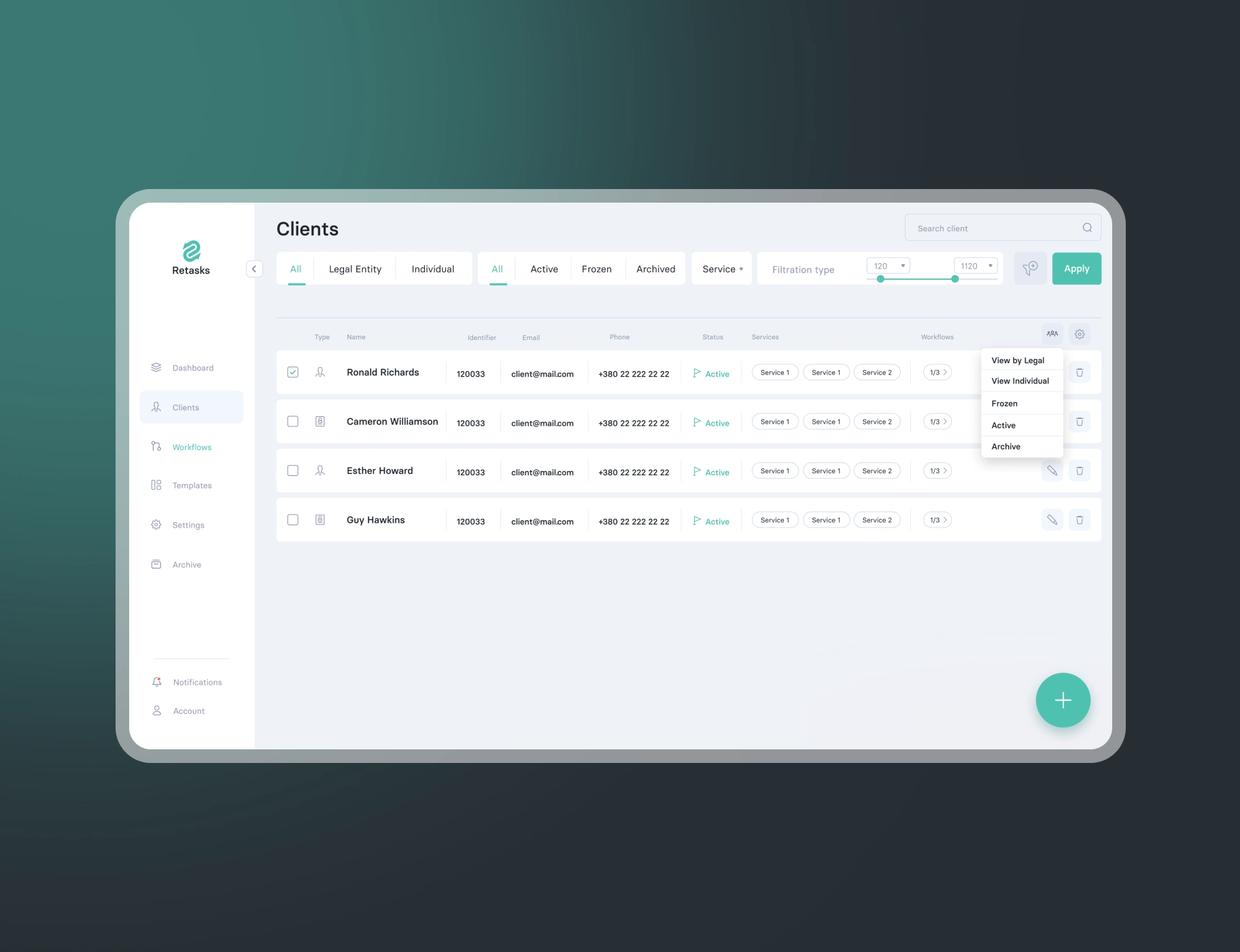 Notably, it offers the flexibility to categorize clients as individuals or legal entities. Moreover, within a legal entity, employees can create multiple contacts for more comprehensive client oversight.