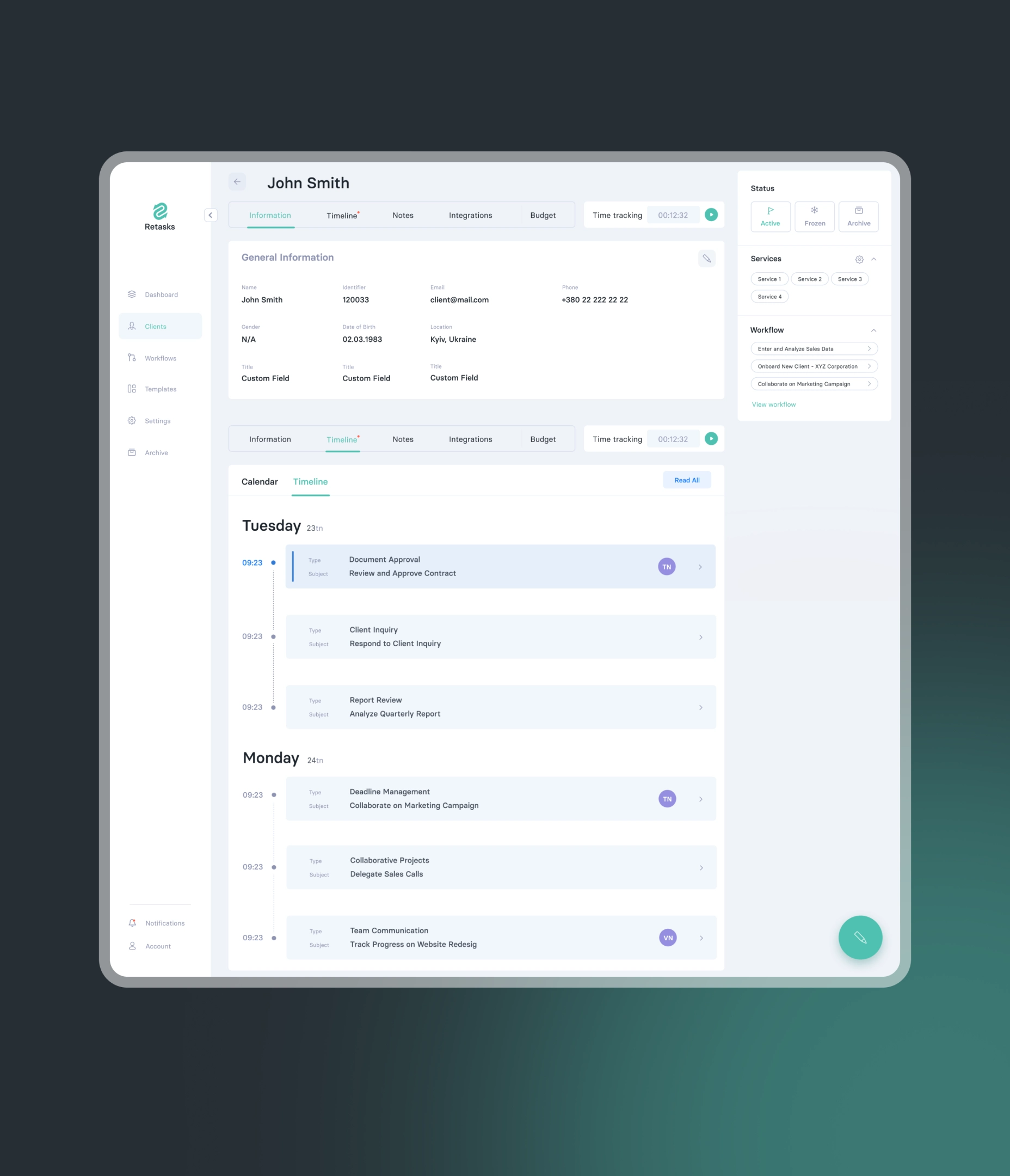 In the quest for efficient client management, we designed a specialized module. This module serves as a repository for client records, encompassing project budgets, service history, completed workflows, timelines, and engagement activity.