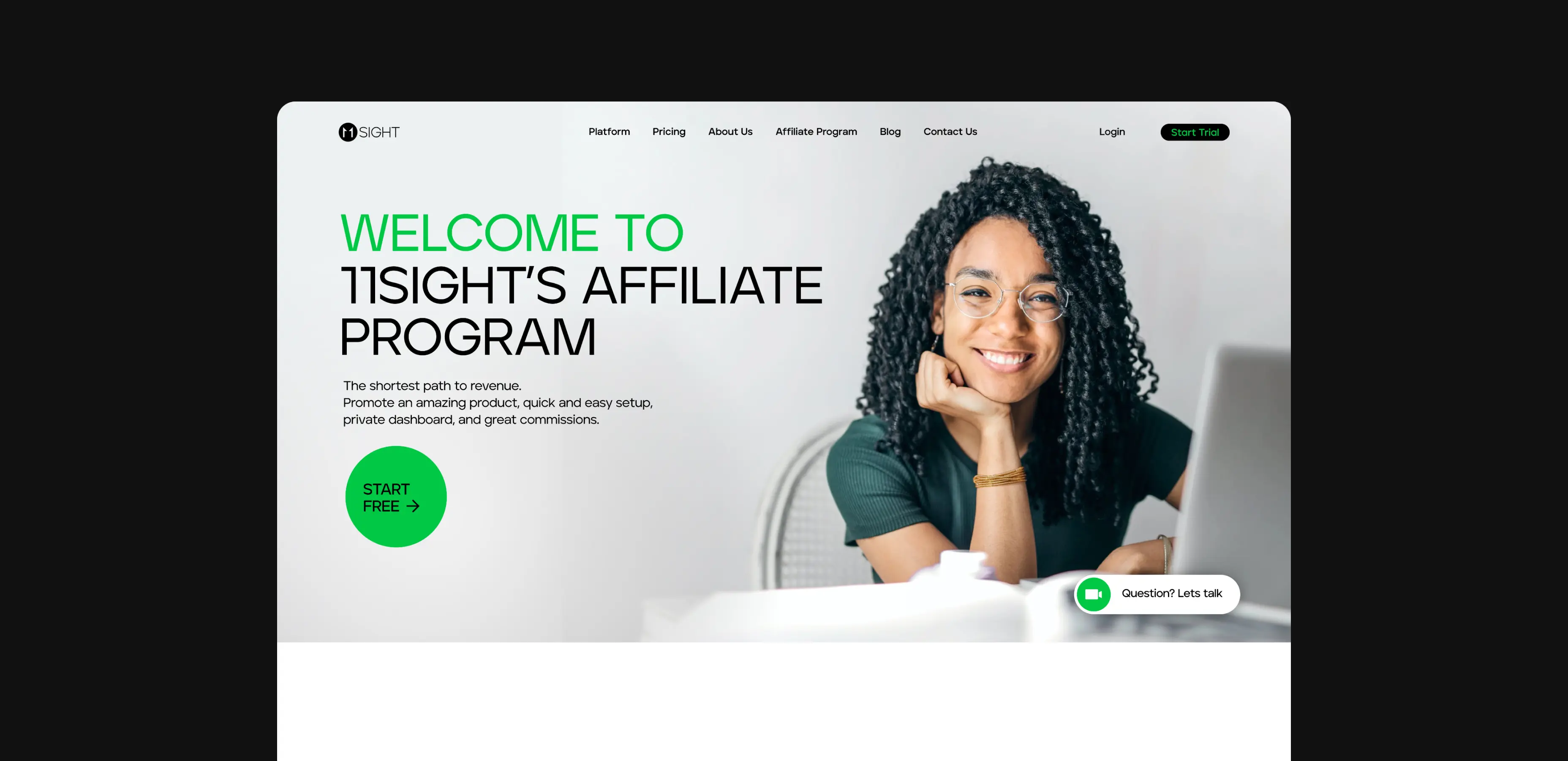 To increase brand awareness, drive traffic to the website and promote the 11Sight product, we created an affiliate program page. Bold infographics, attention-picking graphics, and large typography highlights program benefits and drive people to spread the word about 11Sight.