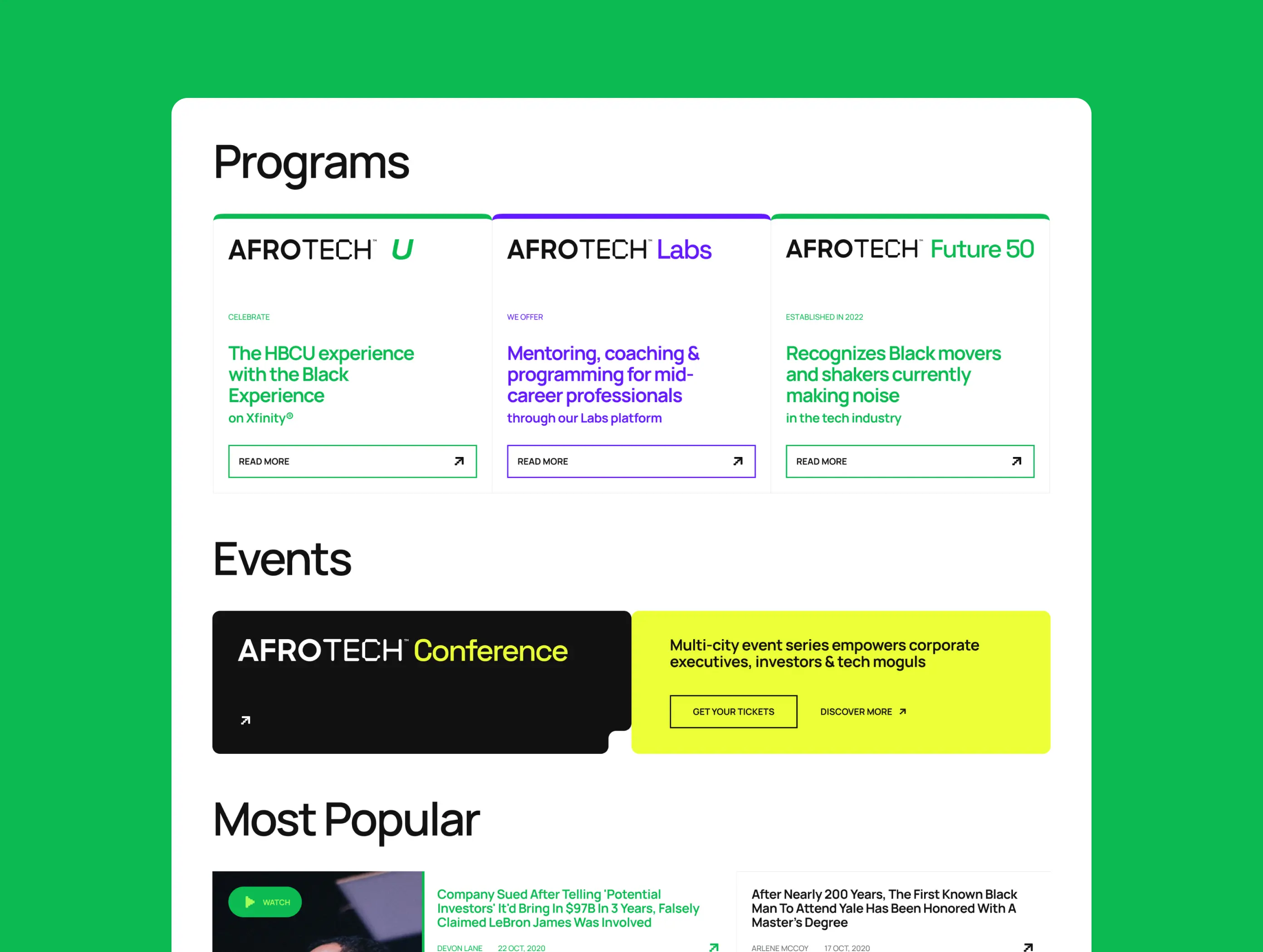 In addition to promoting the Afro community, the website aimed to showcase AfroTech events, job opportunities and  promotional offers of the client's subsidiary projects. So, we intentionally placed CTA banners guiding people to explore valuable AfroTech offers.
