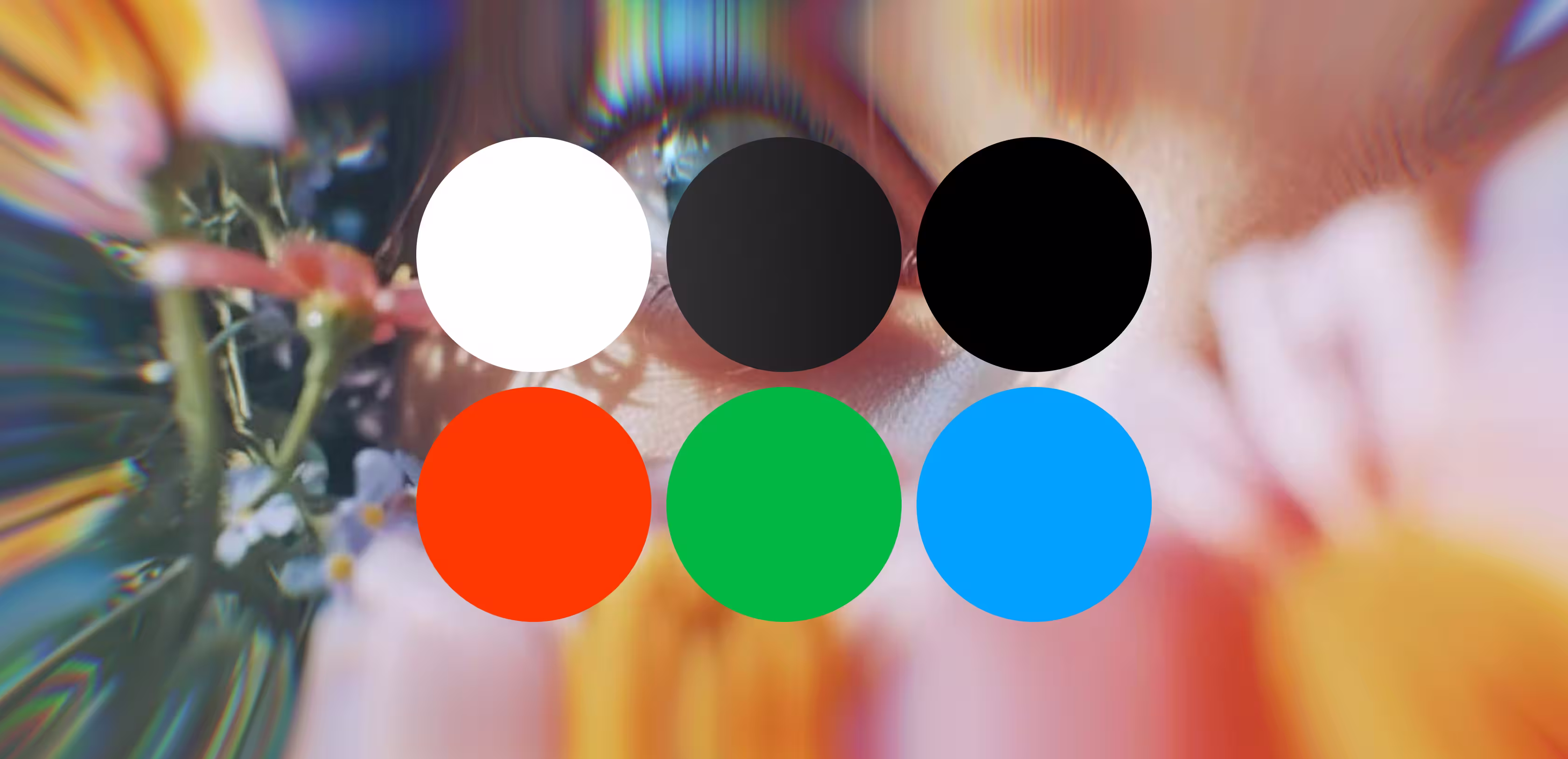 The color system starts with a strict foundation: black backgrounds, white text, white UI elements. That’s the base. Everything else comes from chromatic aberration — the prismatic color fringing that happens when light passes through curved glass. We made this the signature visual element of the whole brand. In practice, the colors users see in the interface are enhanced, slightly more saturated, subtly distorted versions of their own uploaded footage.