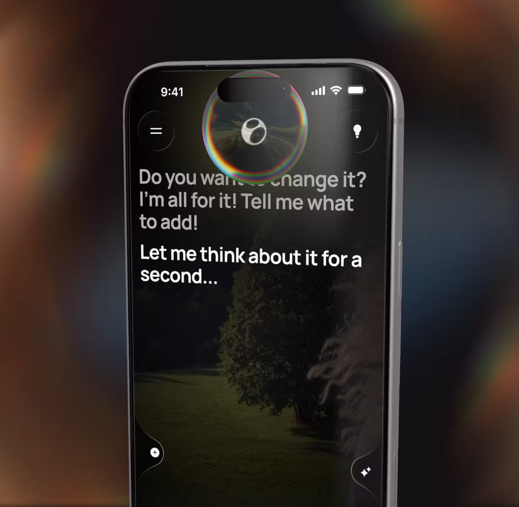 A face locks a persona to a specific age, gender, and cultural read. Elva is meant to sit naturally inside any user’s life, from a teenager filming their friends to a grandparent editing family holidays. The glass blob carries personality through motion, material, and sound rather than features, which keeps the persona expressive without being prescriptive. The material — glass — also reinforces the product promise: the AI refracts what you give her.