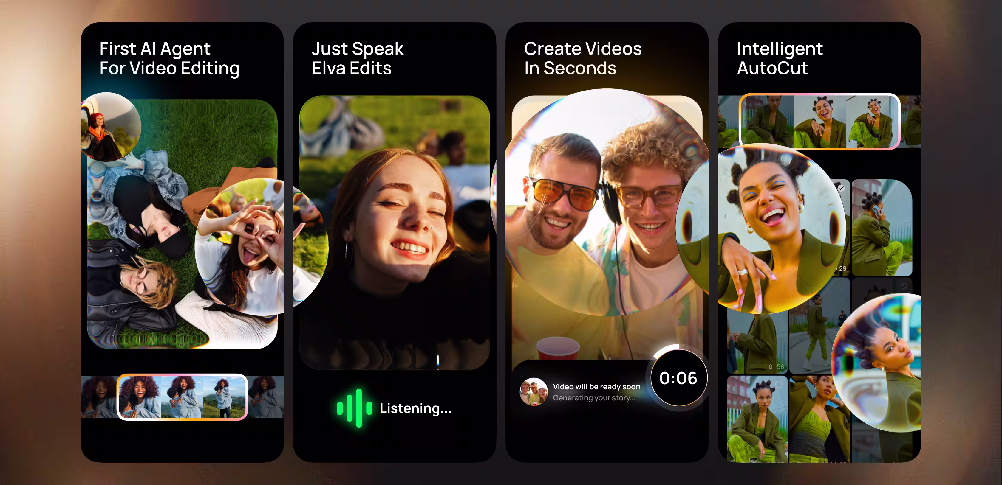 We designed screens that lead with the glass blob and chromatic aberration, establishing a visual language that looks unlike any other video editor in the store. The screenshots show Elva in action — the blob reacting to footage, the conversation interface mid-flow, the before-and-after of raw clips becoming finished videos — all on the signature black background with text-driven UI. The goal was a single reaction from someone scrolling the store: this doesn’t look like an editing app. This looks like something new.