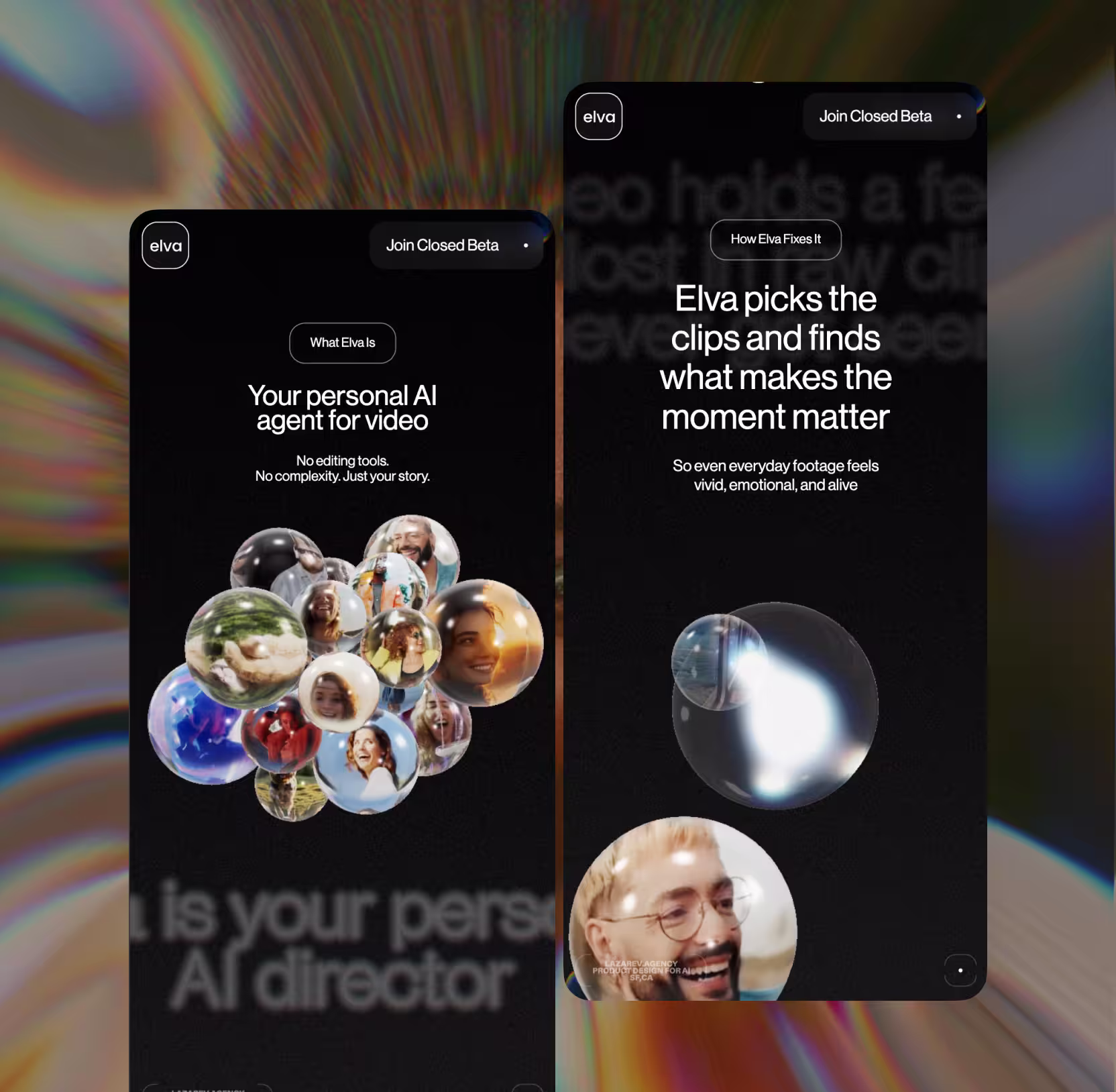We designed the site as a gallery of real user-style footage rather than a traditional marketing page. Autoplay clips run continuously throughout — a beach vlog here, a birthday montage there, a behind-the-scenes reel below — each one an example of what Elva produces when a user hands her a camera roll. The brand system wraps that content instead of competing with it: the black base, the glass blob reappearing as a cursor companion and scroll marker, the chromatic aberration edges that make every video feel refracted through Elva's lens.