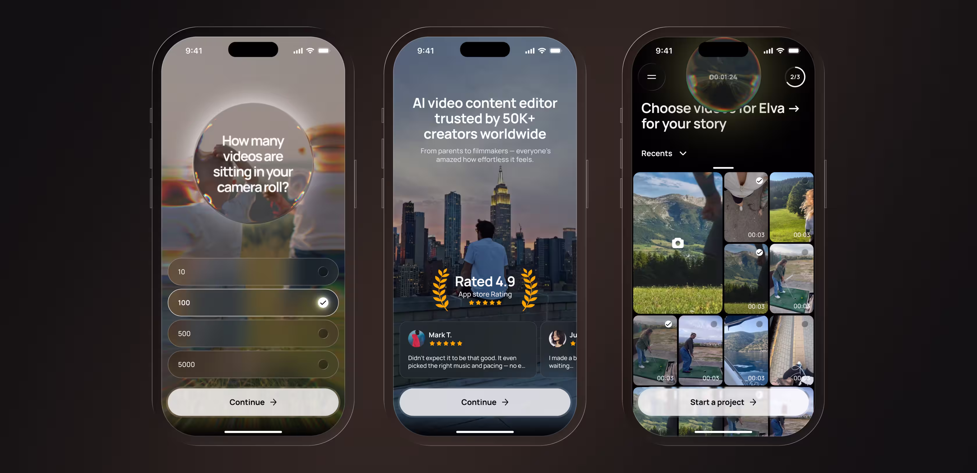 We built a conversion-optimized onboarding flow that bridges App Store discovery and the personalized in-app experience. At its core is a personalization quiz that does two jobs at once: on the surface, it collects preferences to tailor Elva’s first output; beneath that, each question is written to surface the cost of inaction. 'How many unused videos are sitting on your phone right now? Hundreds? That’s a lot of memories going unseen.' By the time users finish the quiz, they already feel the gap between what they’ve captured and what they’ve shared.