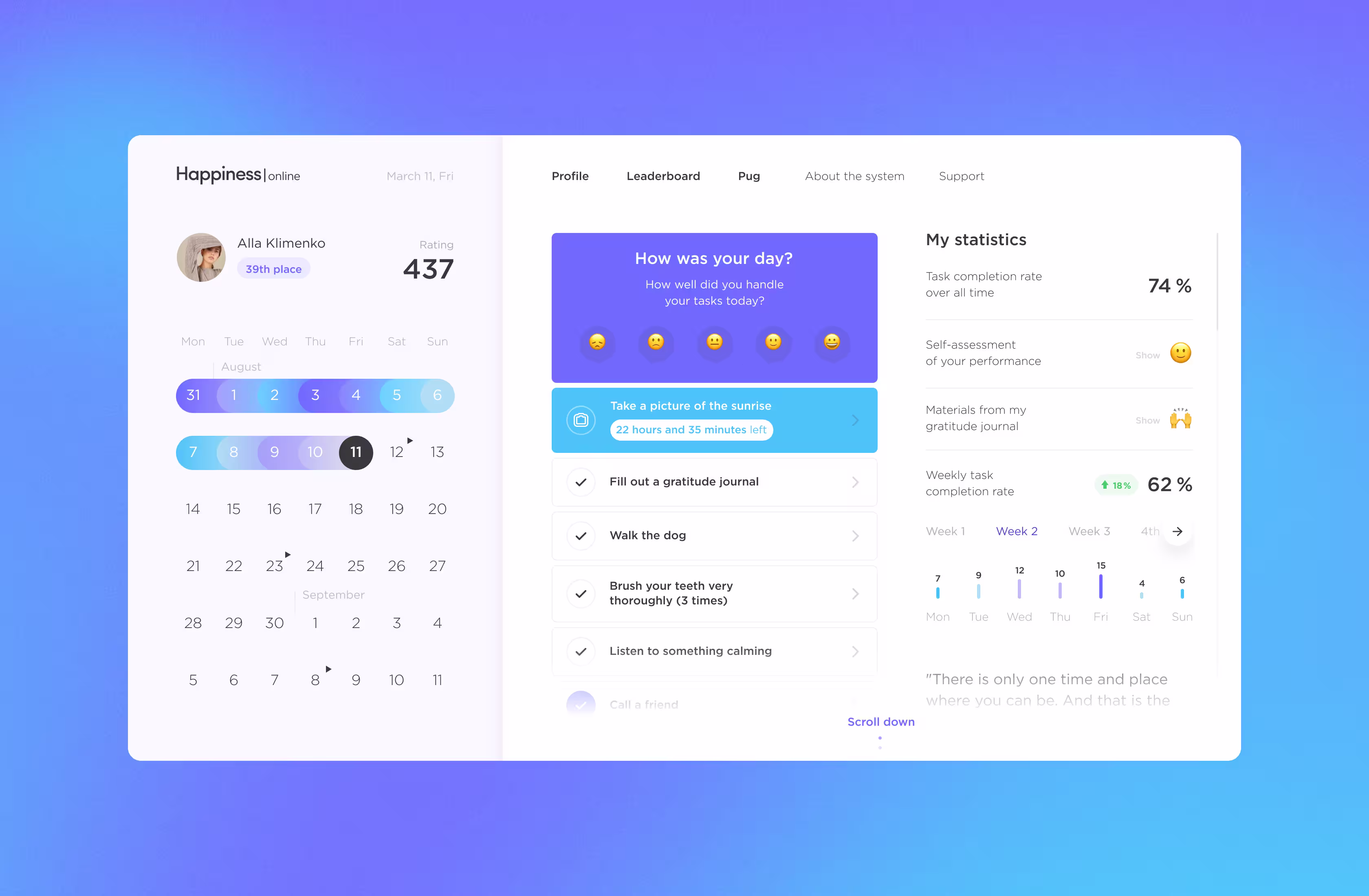 To turn happiness into habit, we built a system that rewards consistency. Six core gamification elements—color-coded progress calendars, leaderboards, badges, ratings, progress stats and more kept users engaged across the full 6-week journey.