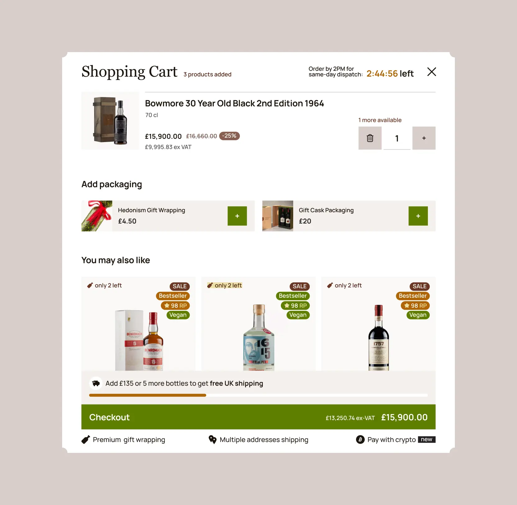 Reducing cart abandonment requires simplifying the checkout process and instilling confidence in customers. At Hedonism Wines, we streamlined the entire conversion funnel by adding product recommendations, clear labeling for ratings, and strategically placed offers. The cart experience was enhanced with progress indicators and trust signals, such as security badges and delivery timers. These changes improved purchase confidence and led to a 45% increase in checkout completions.