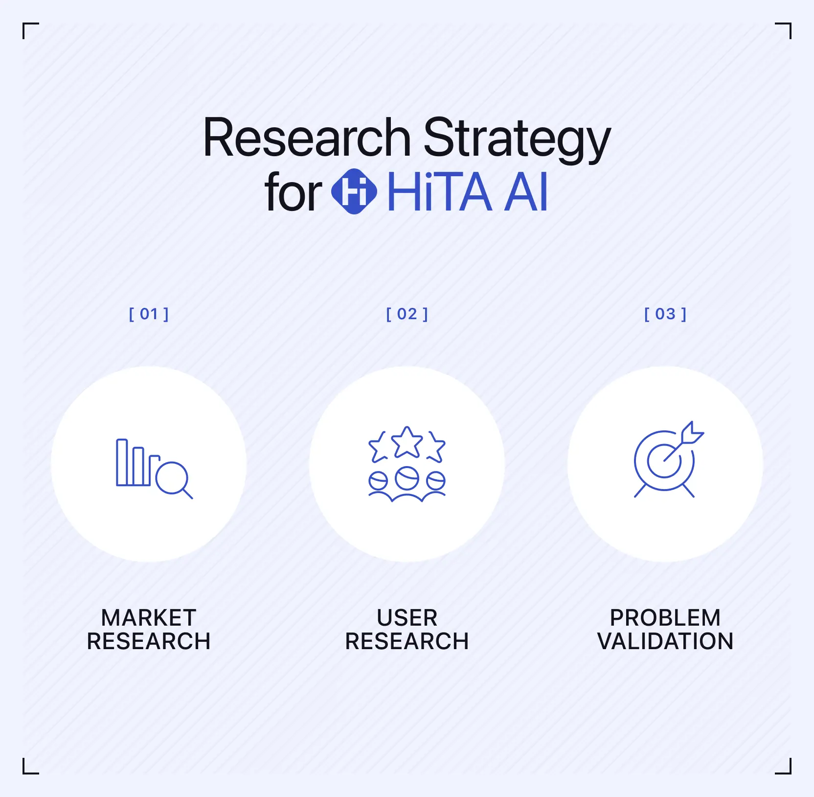 HiTA’s main challenge was uncertainty around its product development path: the team lacked clarity on what to prioritize and when. This slowed down decision-making and prevented the formation of a sustainable long-term strategy. We designed a research strategy built around three pillars: market research, user research, and problem validation. This structured approach turned scattered observations into actionable insights.