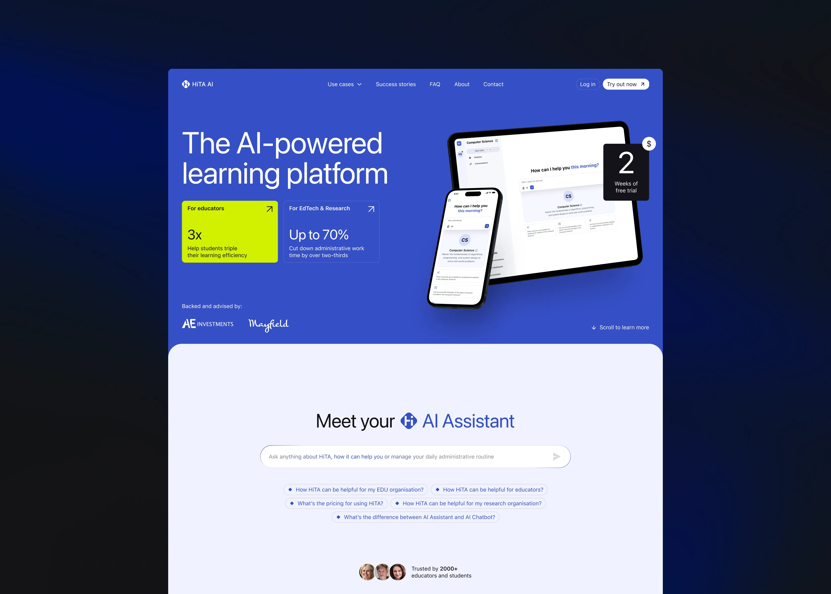 HITA is an AI-powered learning platform for students and educators, specializing in subject-aware assistance, offering hints instead of direct answers to foster independent problem-solving. While the product had strong pedagogical value, its growth was limited by unclear messaging and a lack of long-term strategic direction.