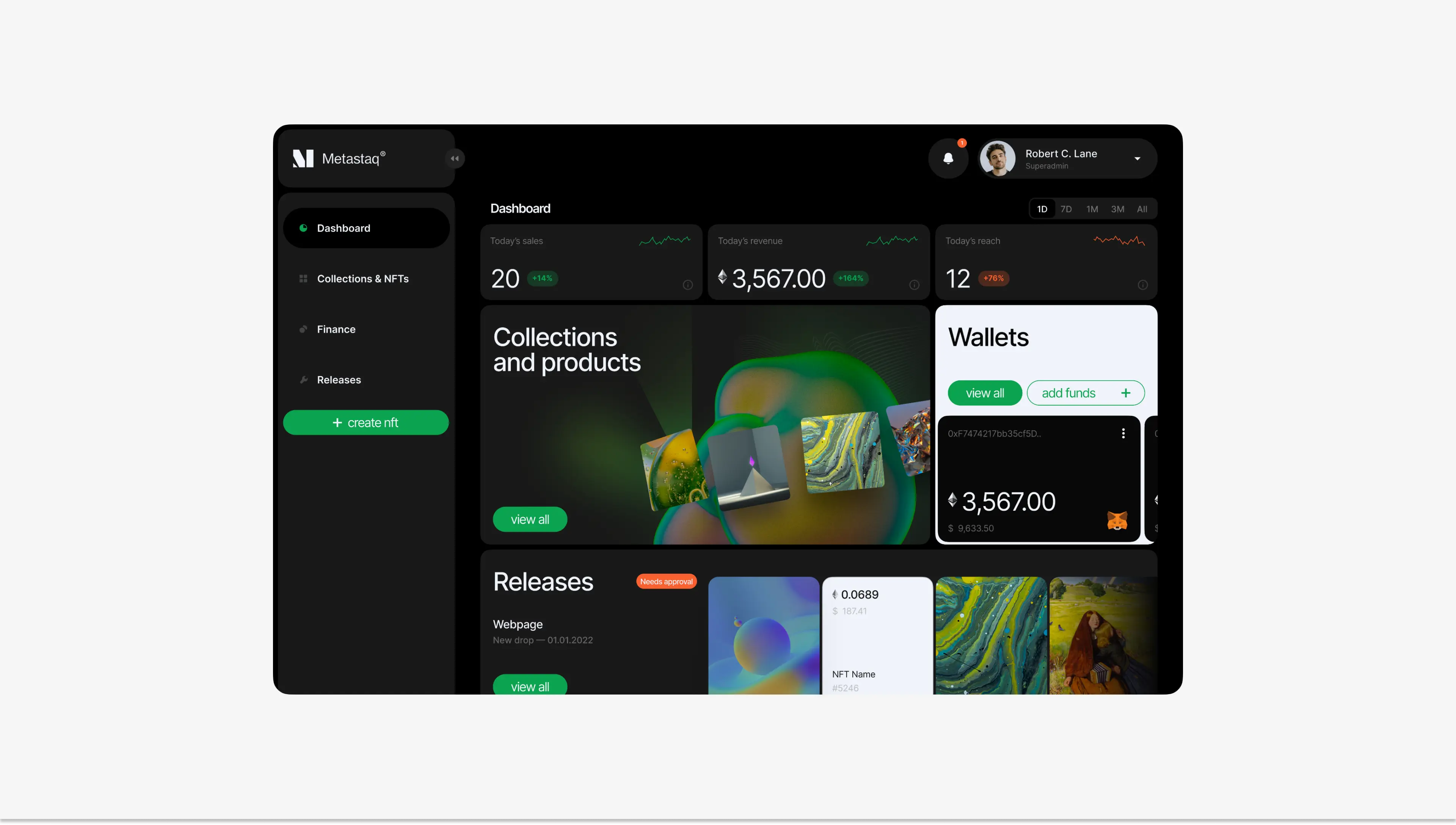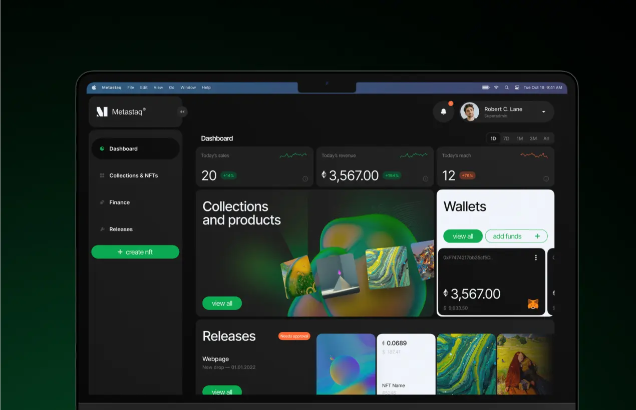 Metastaq's dashboard features a compilation of useful widgets, prioritizing frequently used functions. The center holds key information like releases, NFT collection, and wallet, while KPIs and statuses are minimized and placed at the top and bottom.