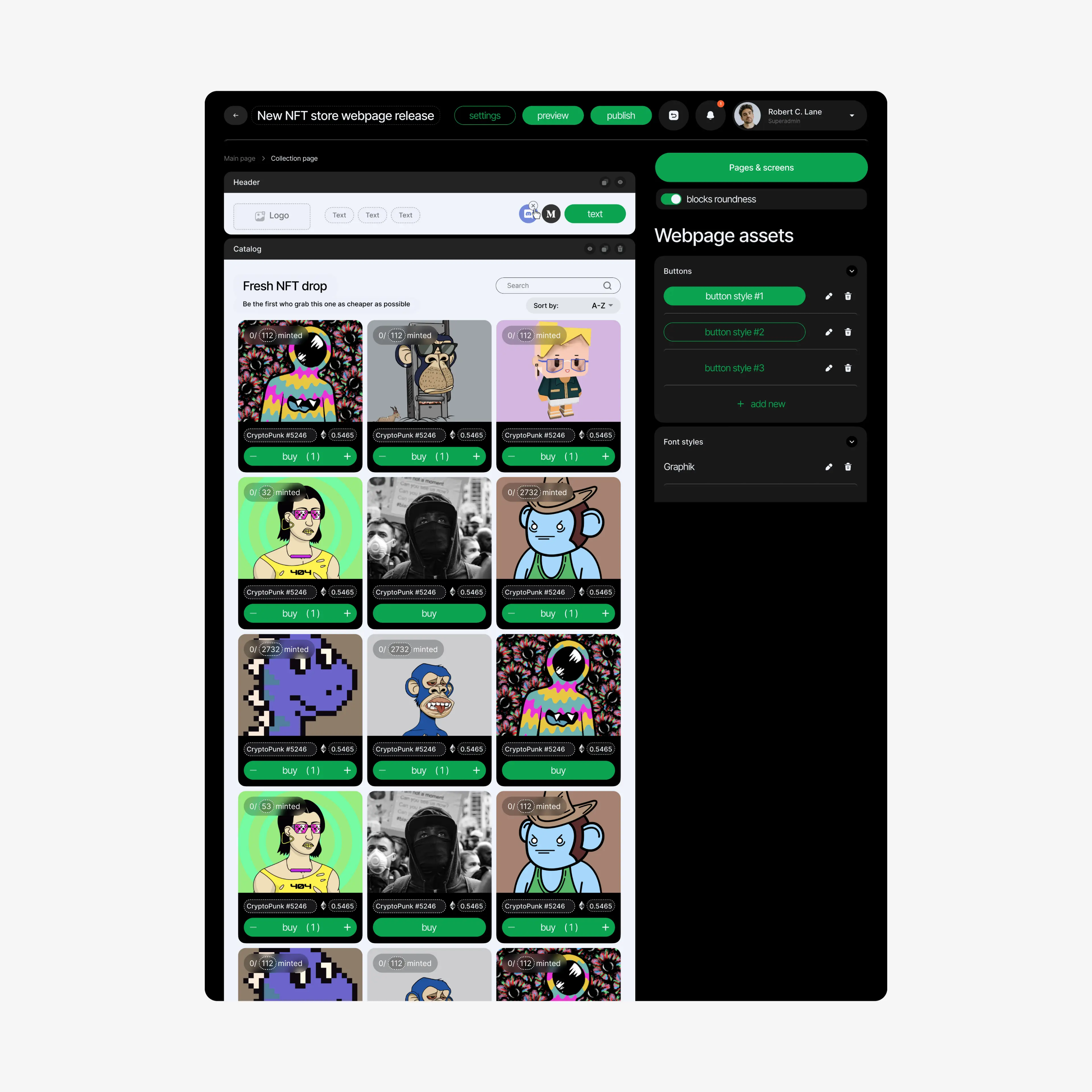 The NFT store builder plugin allows brands to effortlessly create an e-store featuring their minted NFT collection. This enables immediate availability for purchase. The builder offers extensive settings for maximum flexibility and customization. Users need to simply select the desired NFT collection, install the template, fill in the block information, and click "publish."