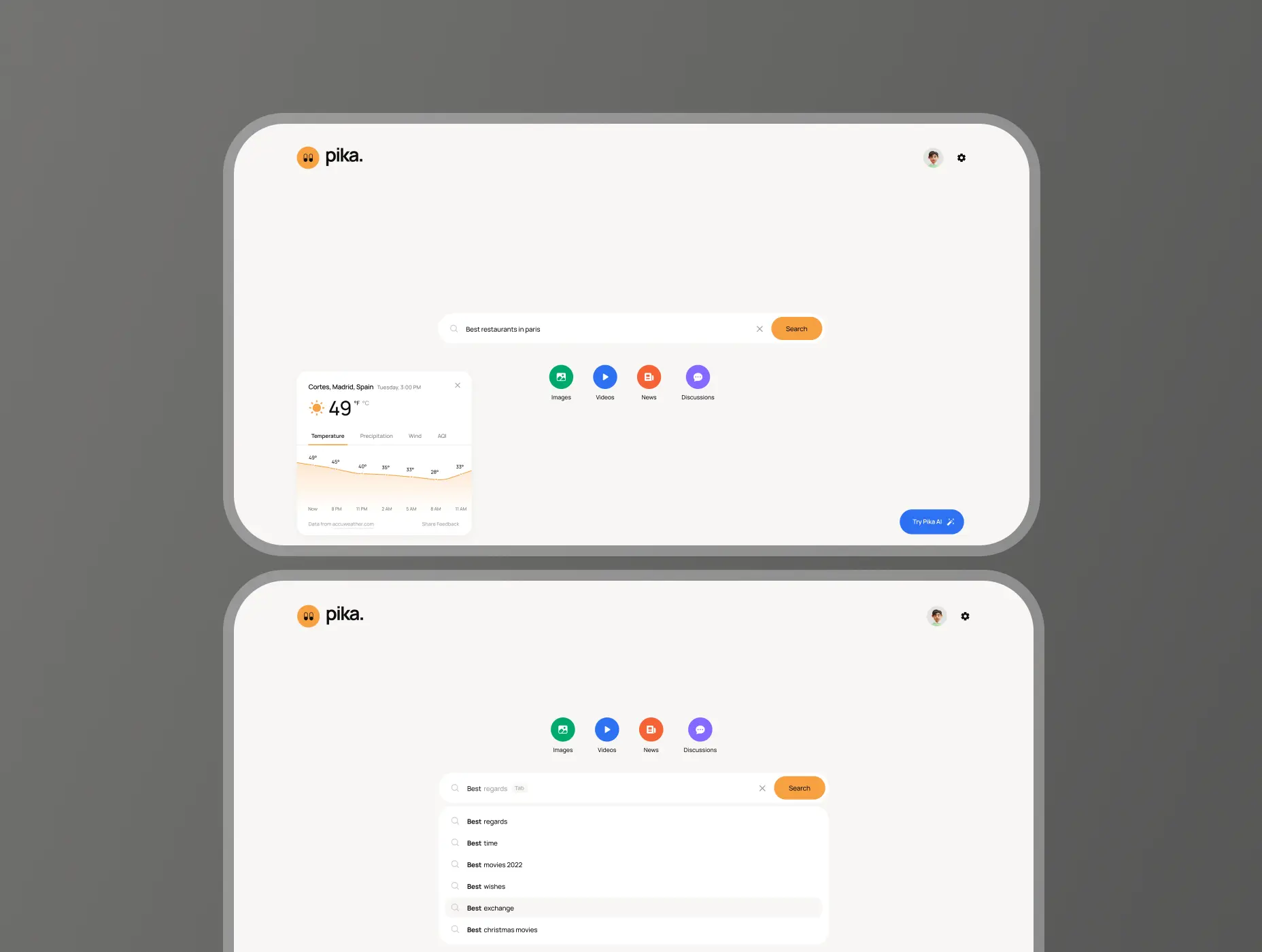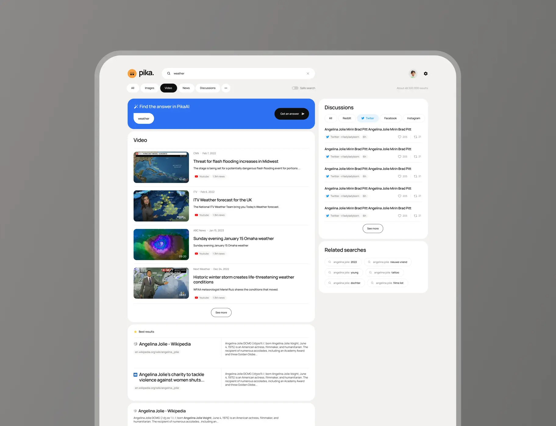 As users input their search queries into Pika AI, they are  presented with a dynamic SERP page that offers a rich array of content.