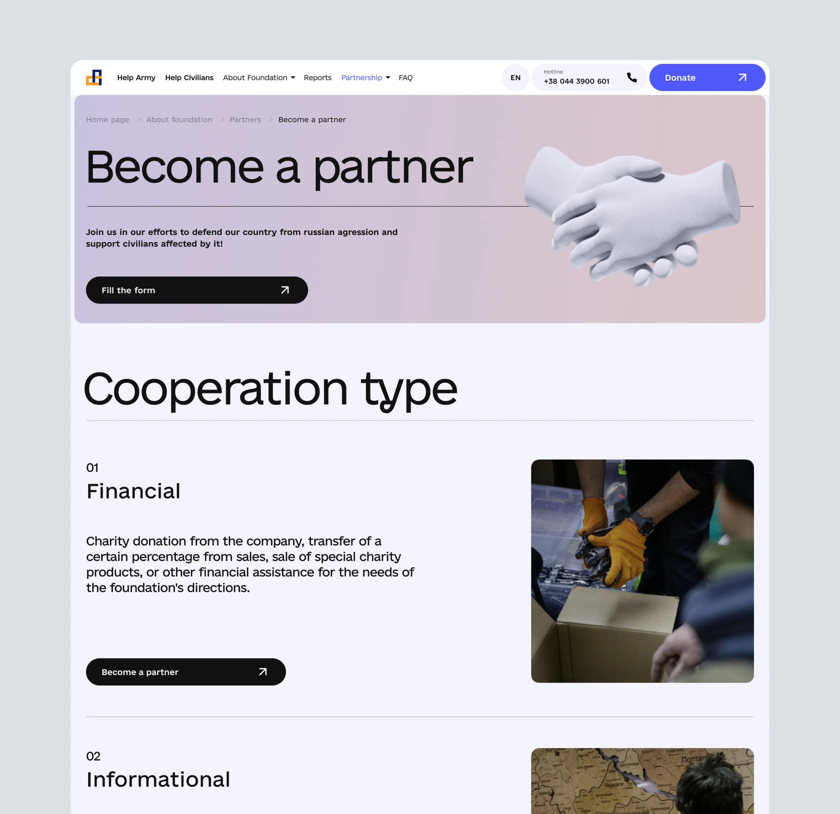 The approach centered on simplifying the donation process, making it as effortless and intuitive as possible for users to contribute or seek assistance. We aimed to create a unified online hub where people could easily access detailed information about the Foundation's work, whether they wanted to support frontline military units or local medical centers. The goal was to reduce barriers to giving and receiving aid, turning complex procedures into just a few clicks.