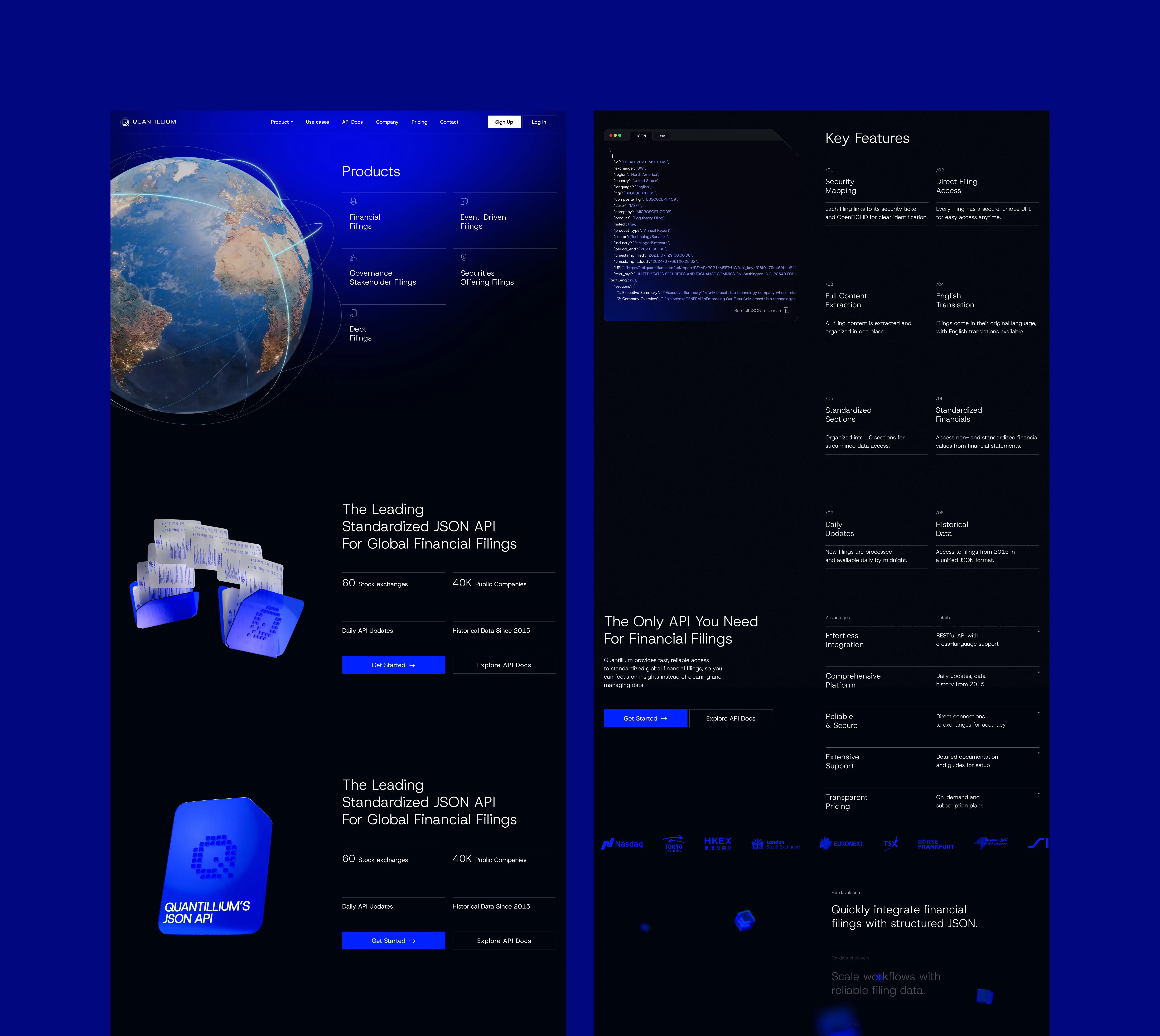 Quantillium’s users: developers, financial analysts, and decision-makers, demand accuracy, clarity, and speed. We turned complex JSON datasets into a clear and engaging landing page experience tailored to their needs. From the very first screen, the website demonstrates the product in action: data is integrated into a structured storytelling flow, where each block highlights the API’s value and practical use cases.