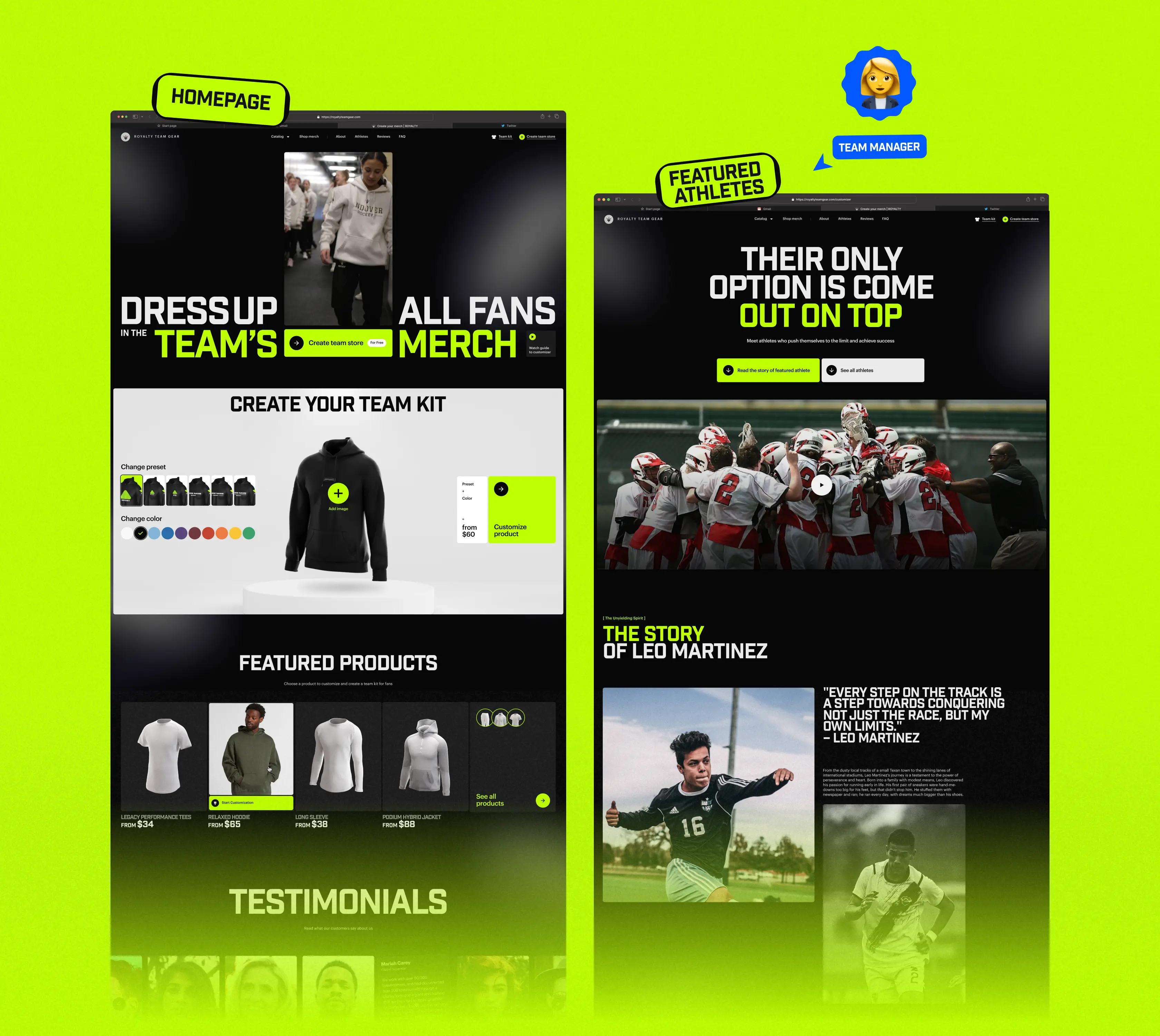 The old homepage didn’t tell Royalty’s story or involve users. We redesigned it with real-time product customization, clear value propositions, and athlete-driven storytelling. New sections showcased benefits, featured collections, and calls-to-action, while new functions like team store creation and the merch design customizer actively invited users to participate. The homepage shifted from passive browsing to active engagement and conversion.
