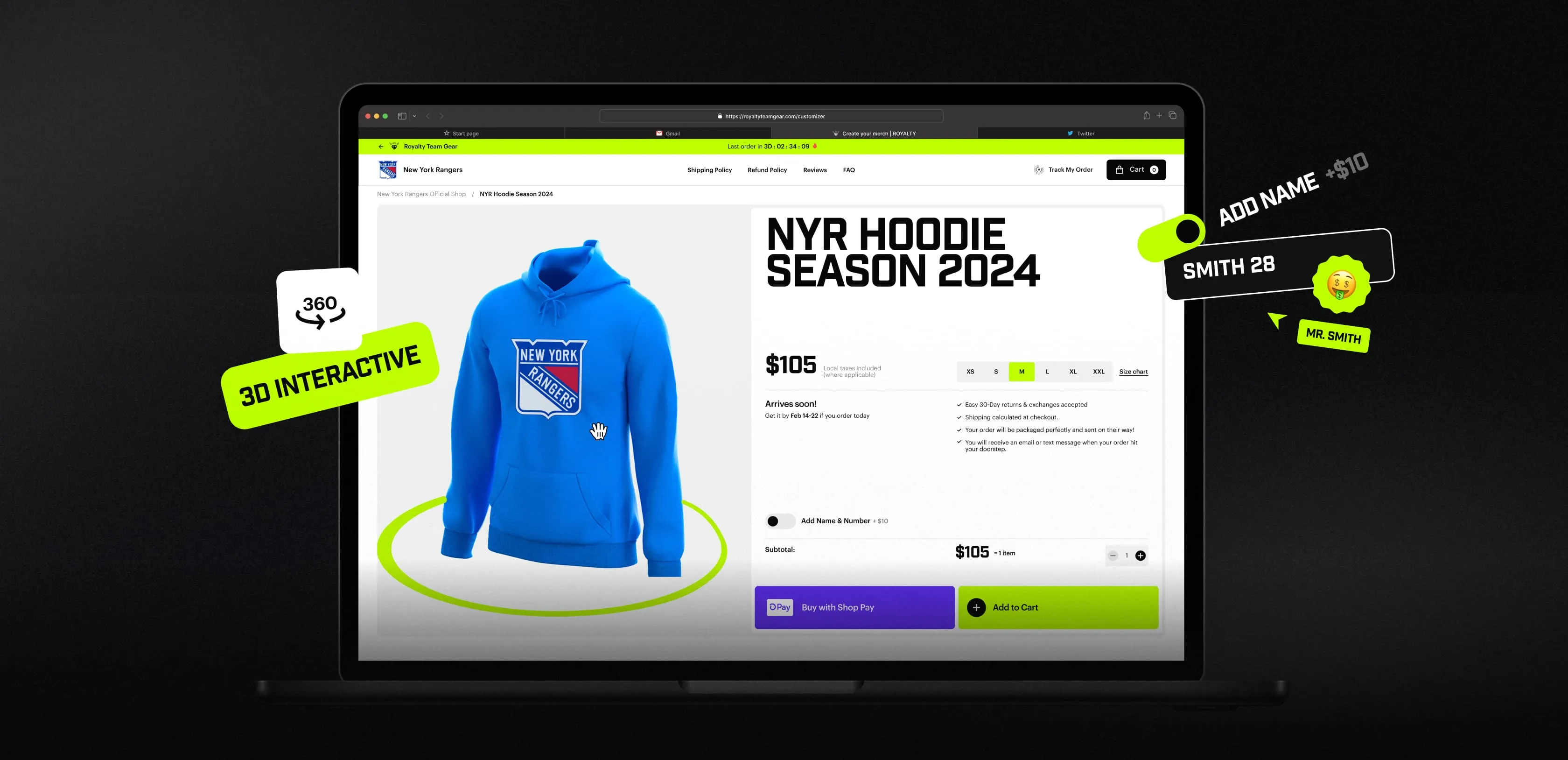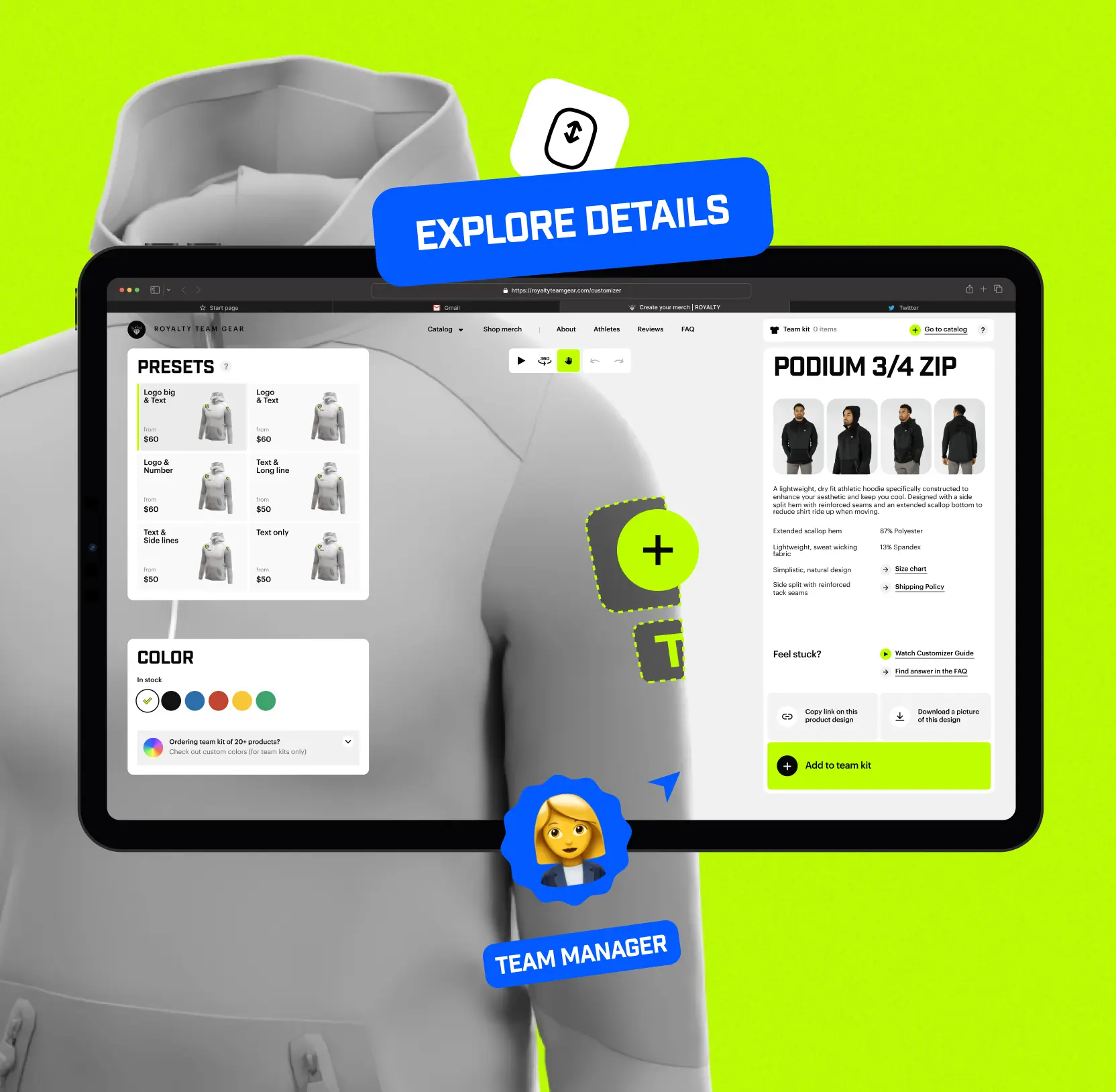 We merged best e-commerce practices with advanced customization features. Following Royalty’s brand guidelines, the website was infused with the vibrant, energetic spirit of college sports. Contrasting colors, bold typography, and dynamic layouts conveyed excitement. To highlight merchandise quality, we added 3D modeling, giving fans a chance to view apparel in full detail before purchase.