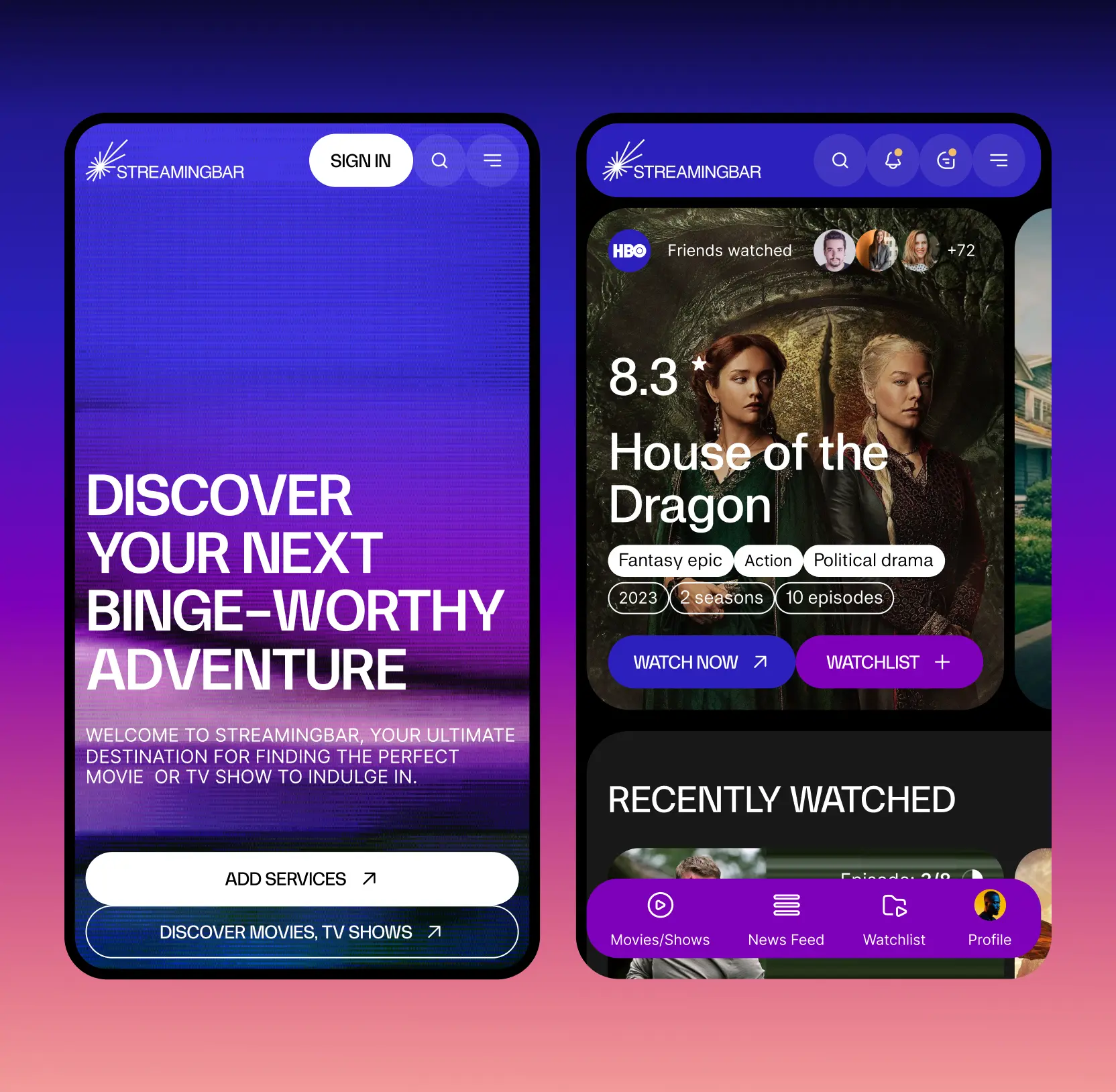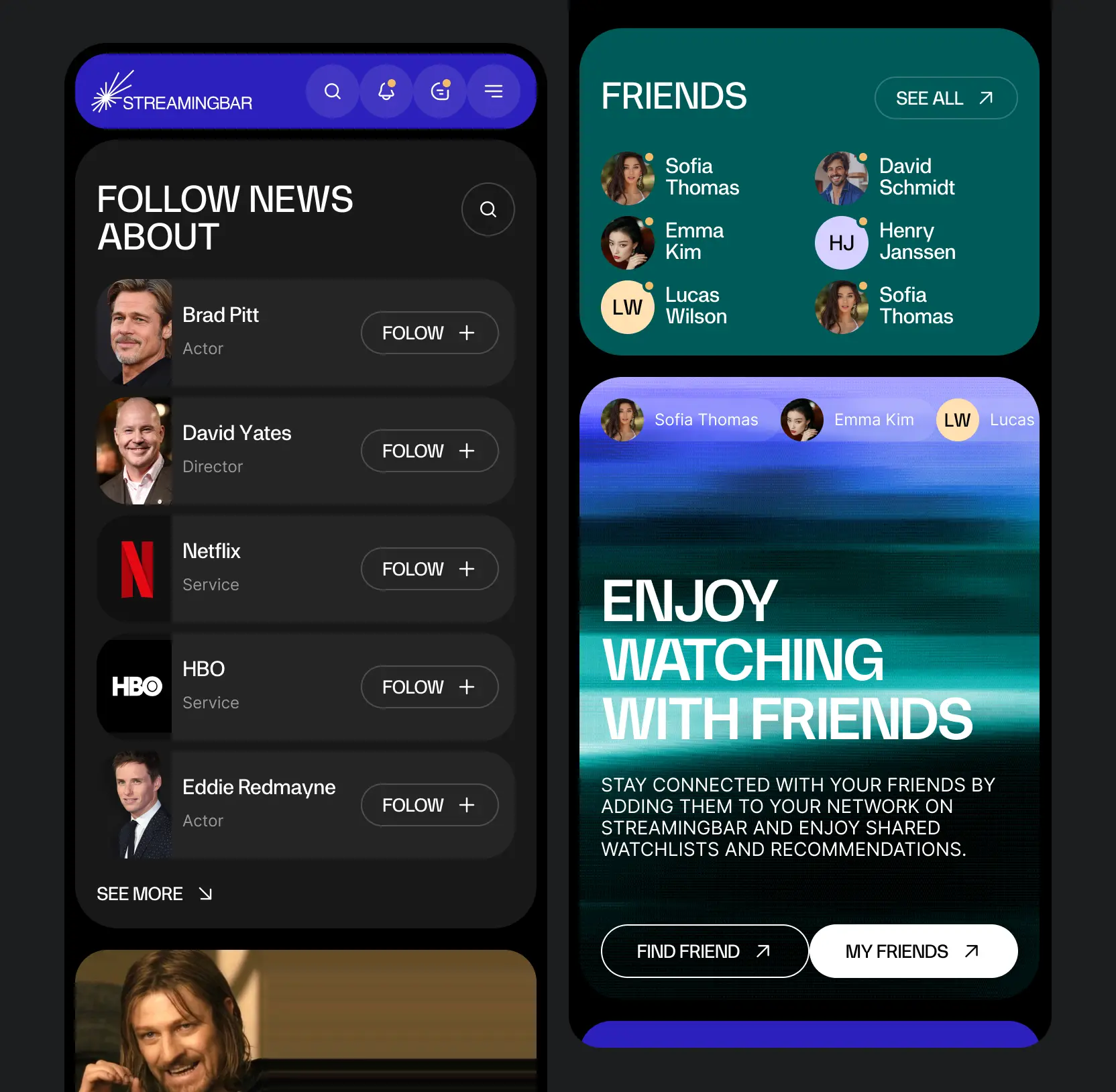 We structured Streamingbar’s interface by prioritizing the most-used actions, ensuring quick and easy access to key features. Based on user research, we introduced a news feed with the latest updates from the world of cinema and a messaging system that lets users connect with friends over shared interests.