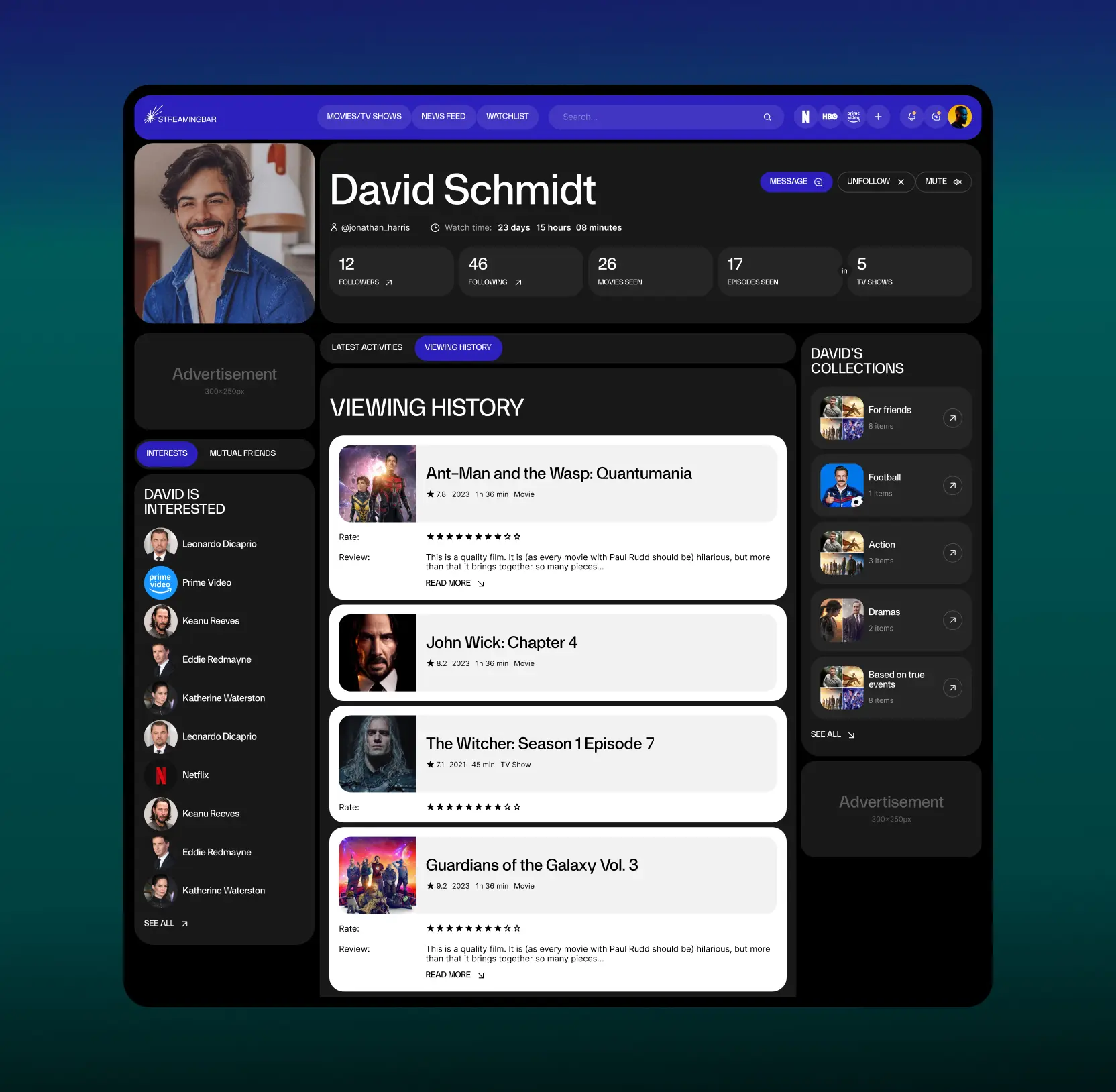 The user profile serves as a personalized hub where users can track their watch time, content consumption, collections, and viewing history. It is designed for both reflection and discovery, featuring detailed reviews, ratings, and tailored recommendations based on individual preferences.