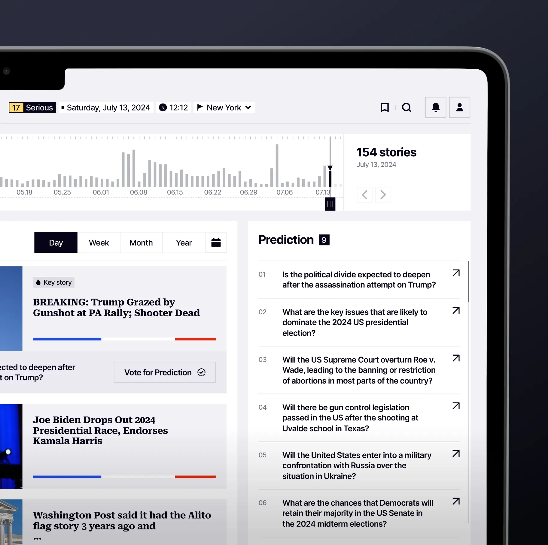 Each topic on the platform is displayed on a dedicated timeline, allowing readers to track the development of events and make informed conclusions. Events are presented in chronological order, and the most significant stories—the ones that sparked a media wave—are marked as "Key Story." The bias distribution bar adds further clarity regarding the narrative's slant.