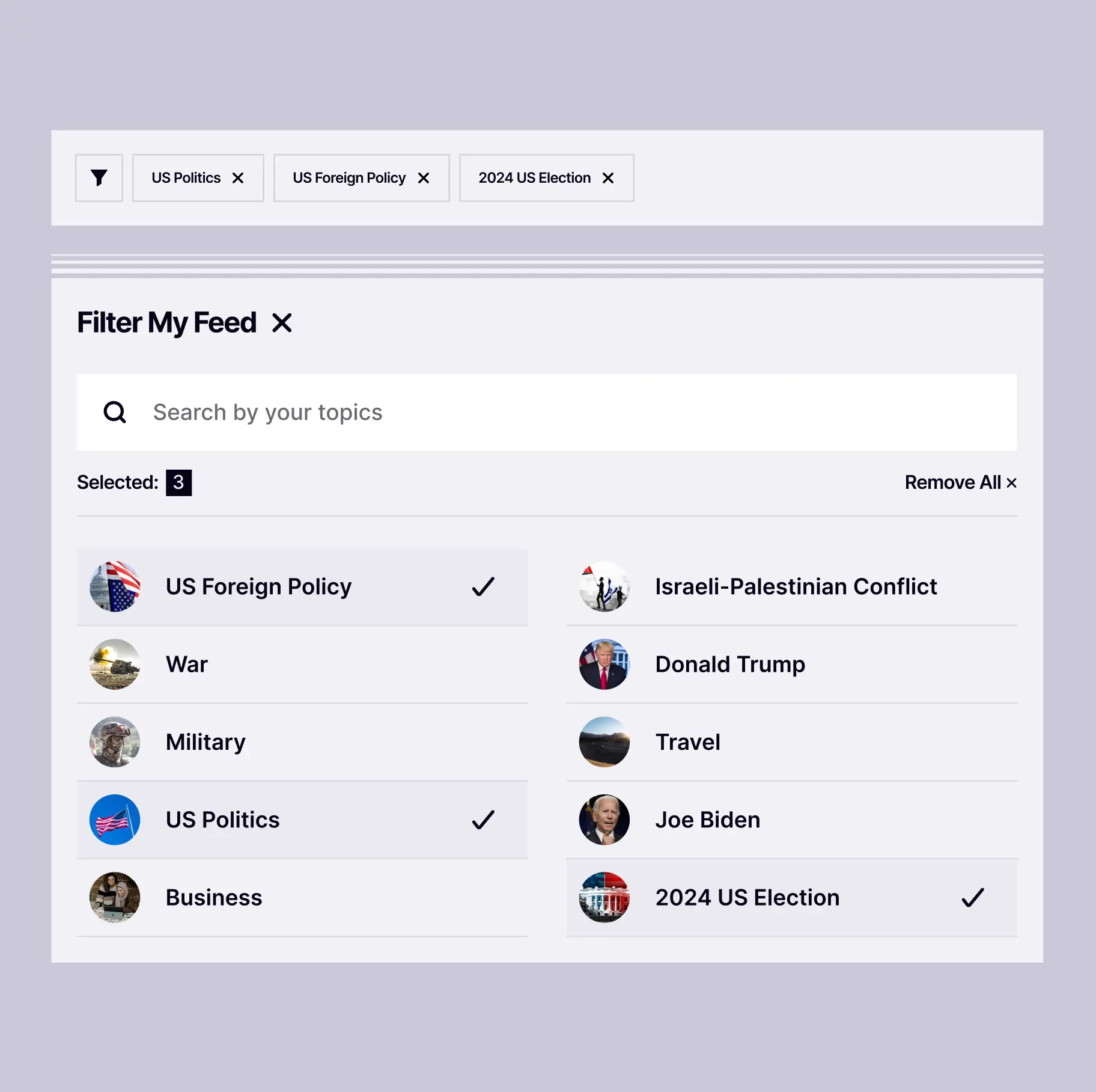 Thematic filters for creating personalized news feeds.